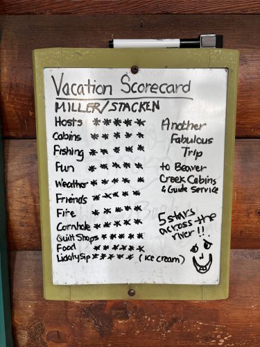 Last week I wrote about the cabin whiteboards. This week the story is about another. I decided to put a whiteboard near the door of the rod shed this year. I wanted to write a few words of inspiration for my guests to see before walking down the dock to go fishing. Kind of like Notre Dame football players seeing …
