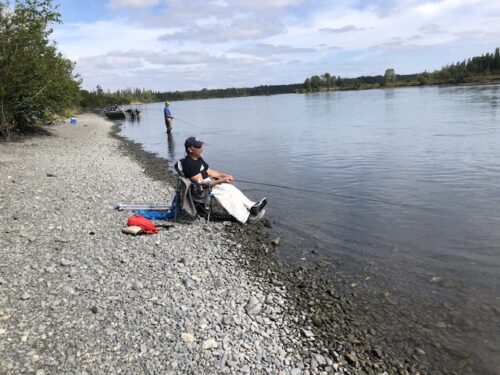 Even though he mostly sat in the boat trying to catch pink and silver salmon, Francis couldn’t help himself and decided to get on shore to try his hand at red salmon fishing. Even from a chair he still had the touch. Amazing.