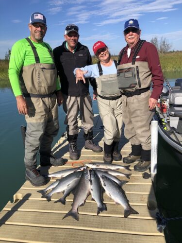 This was the last trip of the year wearing waders. From left to right are Frank, Dennis, Cindy and Steve with a mix of red, pink, and silver salmon. Not a bad way to end the bank fishing part of the season.