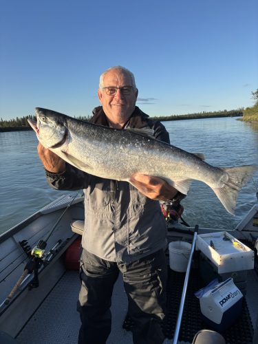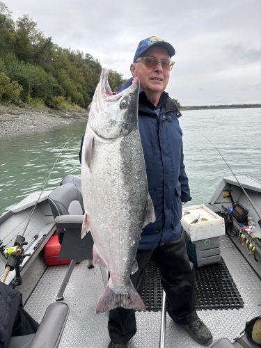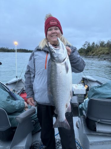 Catching the first fish of the week was Kelly. Recently retired, Kelly and her husband Jeff drove an RV from Minnesota to Alaska. Fishing for salmon was on their bucket list.