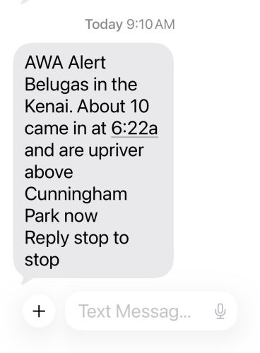 The text alerts come from the Alaska Beluga Monitoring Program. The data is collected by organizations, communities, and individuals and is made available to the public.