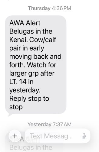 It’s because I signed up for text alerts for beluga whale sightings in the tidal areas of the Kenai River.