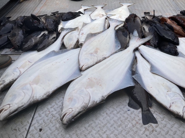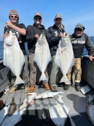 Team Wisconsin, consisting of Doug, Trent, Grant, and Al, fished with Boo on Thursday. They ended up with a nice mix of halibut, p cod, and black bass. Al’s 50lber was the largest halibut of the day. Hey guys, it was great to see you again. Hopefully, we’ll be able to get out on the river the next time you’re here.