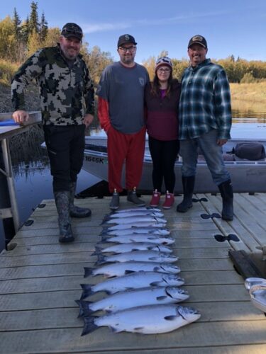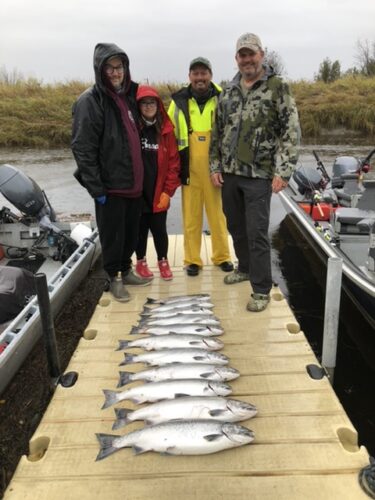 I started the week fishing with long time guests Nick and Brittany along with newcomers Ken (Brittany’s dad), and Jay.  It was a solid, steady bite all day. As you can see in the photo, the average size was impressive. As Nick said, “the B run silvers are bigger”.  He’s right.