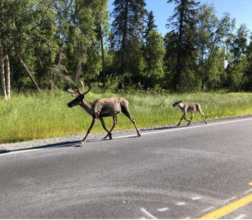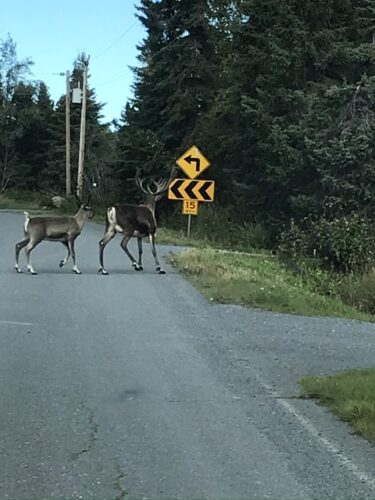 Caribou seem less interested in crossing, but would rather take a leisurely stroll along side the road instead. They often get distracted by reading signs…