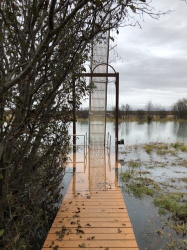 Luckily, on the high tide on Thursday, the dock was able to clear the creek bed ridge and float to the grassy step next to the wood walkway. It will stay there until next spring.